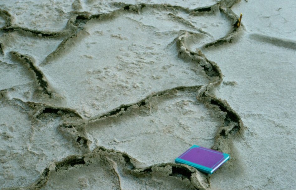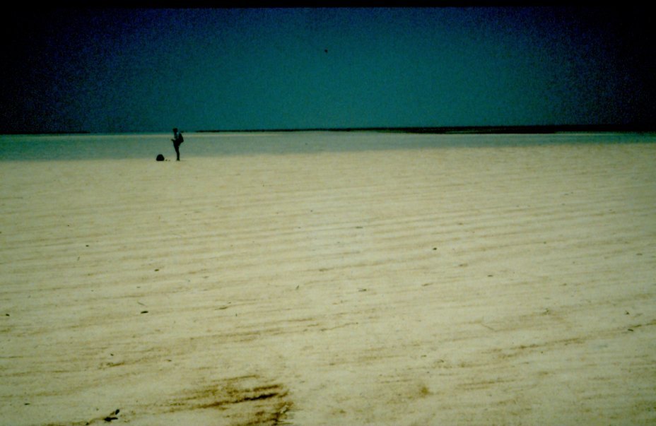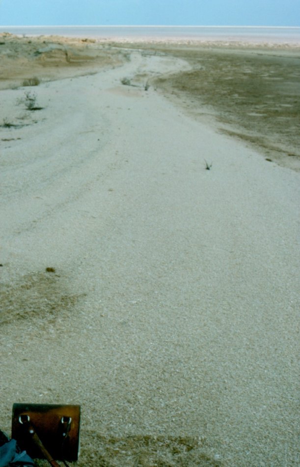 Le lagon est asséché, il est devenu une saline, ou "chott" rempli temporairement d'eau saumâtre, après les pluies. Les structures en "teepee" ci-dessous sont dues à une augmentation du volume de la couche de sel, suite à la cristallisation du dépôt après évaporation de l'eau. Ces "teepee" montrent une structure identiques à celle des formes décrites dans le Jurassique du Haut Atlas, en sommet de séquence émersive (cf. article no 27). Mais dans ce dernier cas, le "teepee" est composé de calcaire dolomitique (magnésien). Le sel a disparu, il est dissous.