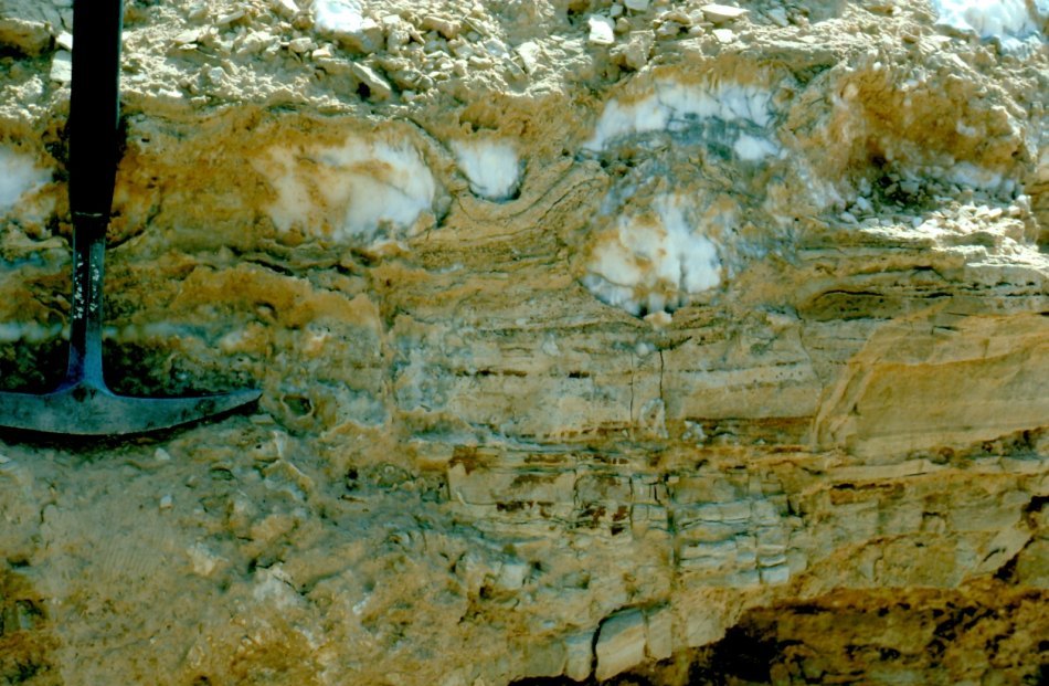 Détail d'un sommet de cycle, avec dépôt de gypse; le lagon est devenu une saline.