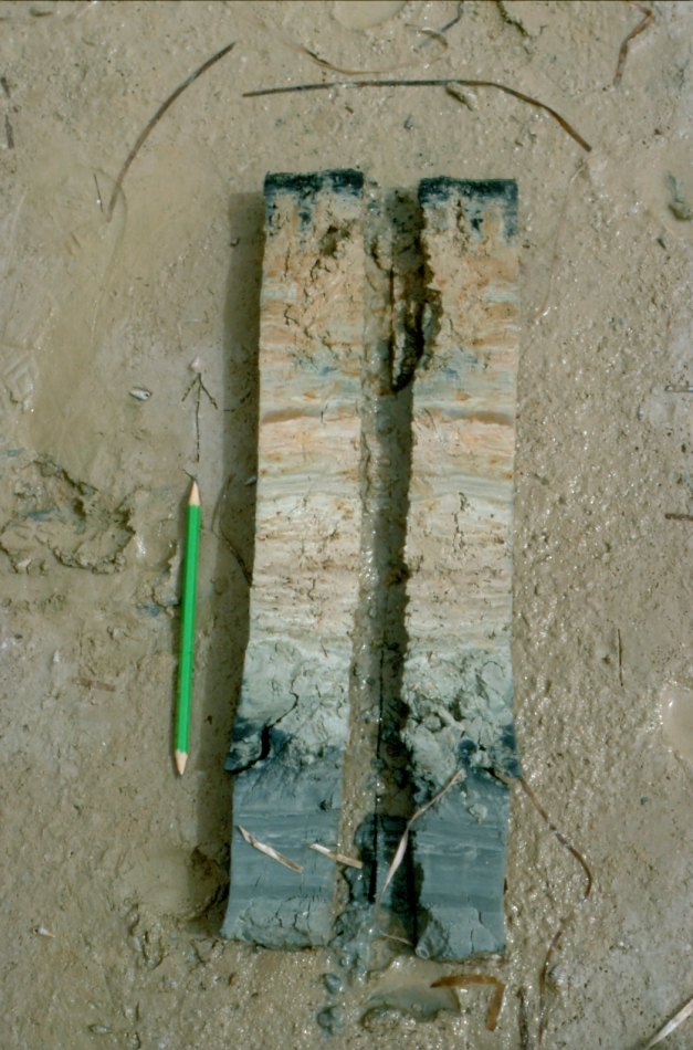 Des carottages effectués par des membres des Universités de Tunis et Genève (stage d'étude sur le terrain en 1993) montrent que l'évolution du lagon est cyclique, dépôts marins en bas (en bleu) puis saumâtres et enfin émersion au sommet (en jaune) avec un sol végétal (en noir).